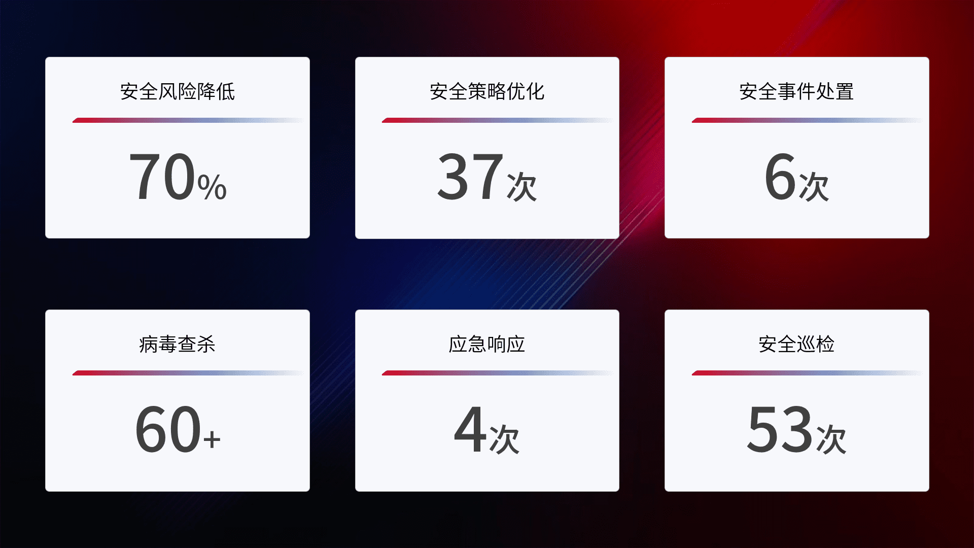 提供全面的安全事件报告体系,,包括处置报告、、周报、、、季度和年度总结,,,,结合持续监控,,,帮助客户深入了解网络安全状况。。